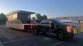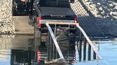 It has two Power tilt decks, one each side. It is 11 foot wide to go down the road on its trailer and 14 ft 5 in tall. No pilot cars needed. It has an electric brake 3 axle trailer. Standard bumper pull. It is 18,000 lbs on the trailer, dry. An F-250 with rear air bags tows it nicely. The electric brakes are used when launching the boat. Makes it very controllable. 4wd Low to pull it out. Not a problem.