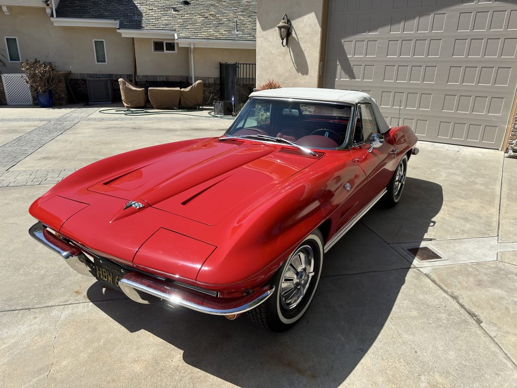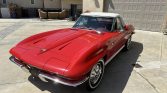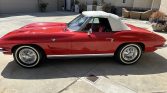 Presenting this 1964 Chevrolet Corvette Stingray convertible C2 finished in its factory Riverside Red paint combined with a matching red interior. This car is powered by a 327ci V8 engine paired with an automatic powerglide transmission. 63198 miles. The car is equipped with concealed headlights, chrome split bumper, white convertible top, power windows, power steering, and white wall tires with original hubcaps. The interior has a factory color walnut three spoke steering wheel, AM/FM radio with an analog clock in the center of the dash. In addition this car comes with the original owners manual.