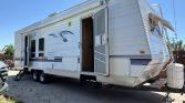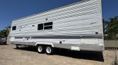 Cargo dimensions are 8 ft. x 14.8 feet (14′-8″ to first cabinet). I have consistently hauled a 16′ sandrail by positioning it with the engine cage facing the front of the trailer. Upgraded D-Ring tie down anchors.