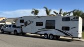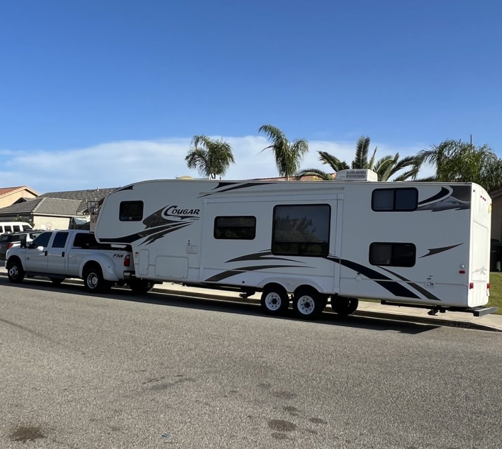 2007 5th wheel Keystone Cougar 314EFS. 35’4” Dry Weight 8350 Lbs. Sleeps 10, Queen bed in the master bedroom, pullout sofa bed, bunk room in the rear, 14 ply tires, plenty of storage with rear garage. Rear slide out bumper. Fresh 50, Grey 56, Black 30. Roof freshly sealed with all vents replaced on 3/26 New awning replaced 4/26. Bearings repacked 7/25, 2nd owner and besides the decals faded everything else is well taken care of.
