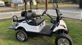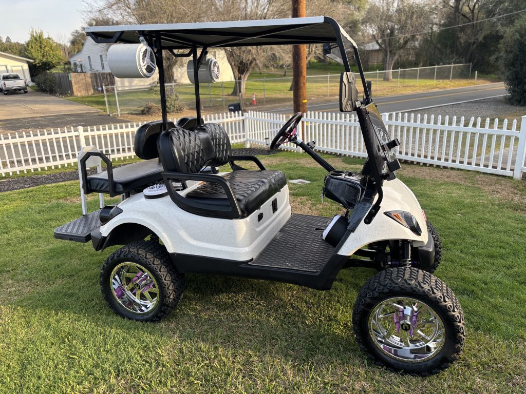 2007 Yamaha Custom lifted Golf Cart! Golf cart has been a blast for our Family and Friends. This Golf Cart is every wife’s dream ride. So many custom features: Jake’s lift kit A-Arm suspension. 23x10x14 AT tires / Deep dish chrome rims, 2 inch spacers all four wheels, custom painted suspension, under glow rock lights, Novitas high performance electric motor, 440 Navitas Controller, lithium Eco Battery 105ah, Bluetooth controls for motor, handheld also. Custom painted Toyota Tundra artic white with pink metal flake. Custom cage, rear seat with grab handles, custom roof with matching paint, flag mount, Bluetooth 8 speaker stereo with 8” subwoofer, 2 Kicker Amps, 2 large capacity 800 CCA truck batteries to power stereo. Carbon fiber dash, custom steering wheel, aftermarket mirrors side and rear. Boat deck marine padding on roof. Windshield, headlights, brake lights, turn signal , voltage meter for stereo and lights.