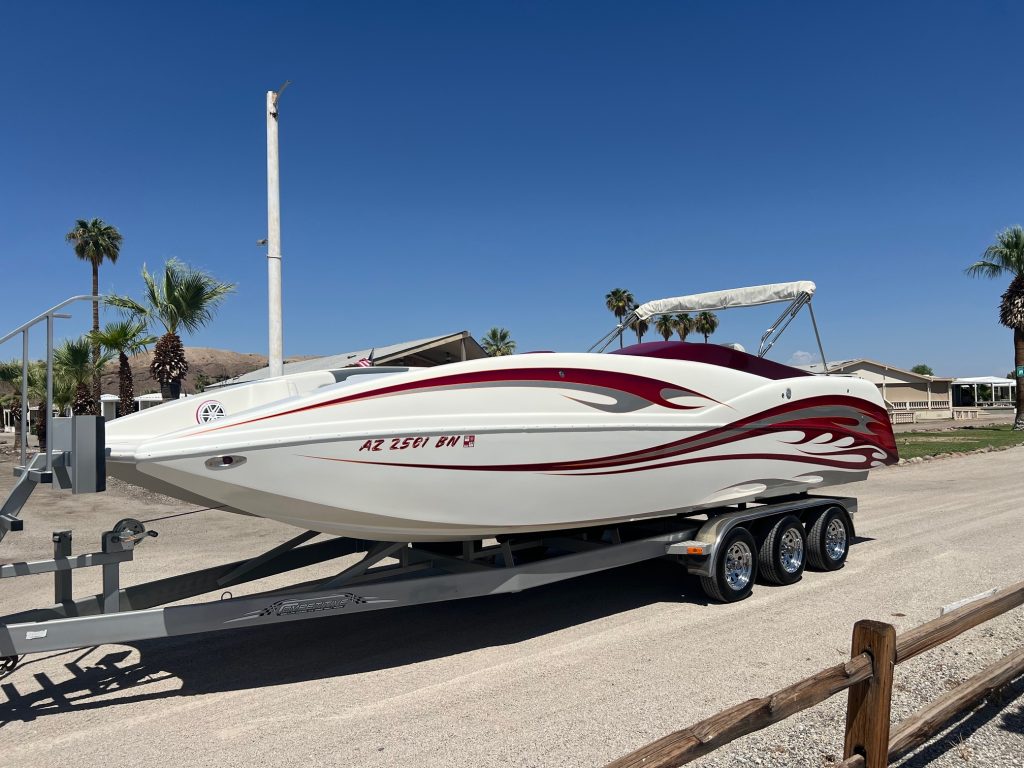 2008 Next 265 Deck Boat. The boat is in excellent condition. This is a one of kind 27′ deck boat special made for the owner with only 201 hours on it. It is powered by a custom built 720 hp Merlin big block with AFR heads and Fast fuel injection system. The prop is a five blade Hering ($3100.00) that drives this boat to well over 80 mph. The outdrive is an upgraded Mercury Bravo one with sportmaster gears and hydraulic steering. All new 2024 updated upholstery with custom fiberglass side inserts and seats. The sound system is top of the line JL audio. It has two 12″ subs and two 10″ subs with five amps and ten 8″ speakers and a JL head unit. It will not disappoint you. The speakers and head unit are all new in 2024. There are three 3 year old extra large Odyssey batteries with an onboard built in charger and Pergo switch. New Seadec flooring in 2023. There is a fresh water wash off sprayer in the front and back. The boat has only been in fresh water and has been serviced and maintained professionally every year. This is a very fun lake boat and can handle big water easily.