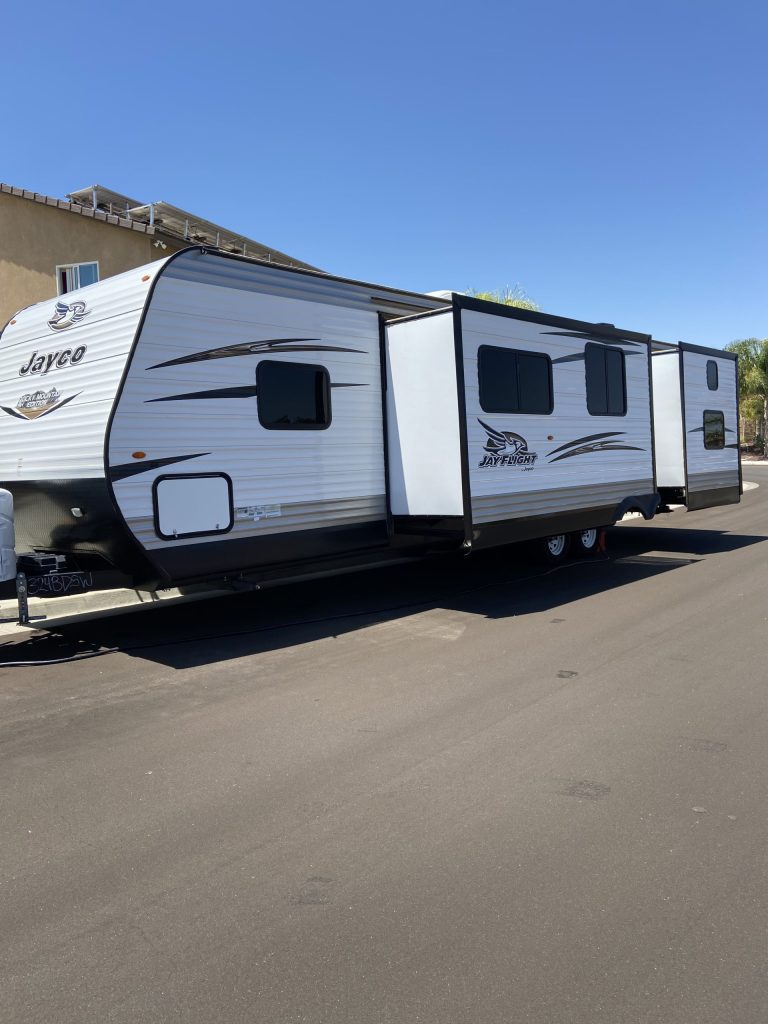 36 ft, 2 slide outs,Sleeps 8-10,Brand new tires,fantastic fan, 2 A/C units, batteries replaced this year with on/off switch for travel and storing, Outdoor kitchen.