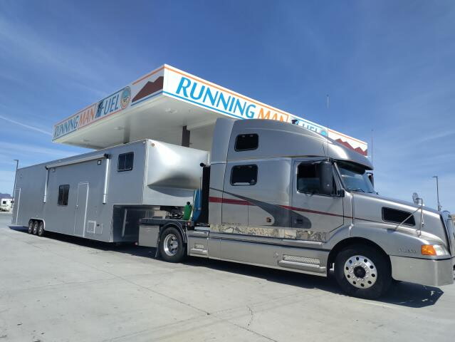 Volvo 2000 60 Series Engine and 2018 Progressive custom 48' fifth wheel. Is this progressive custom fifth wheel has 28 ft of living space stand-up headroom with a king size bed in the master, all aluminum cabinets and custom bathroom. The garage is 20' that will hold any sand car and you do not have to take the tires off. Can be a stacker if you would like.