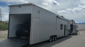 Volvo 2000 60 Series Engine and 2018 Progressive custom 48′ fifth wheel. Is this progressive custom fifth wheel has 28 ft of living space stand-up headroom with a king size bed in the master, all aluminum cabinets and custom bathroom. The garage is 20′ that will hold any sand car and you do not have to take the tires off. Can be a stacker if you would like.