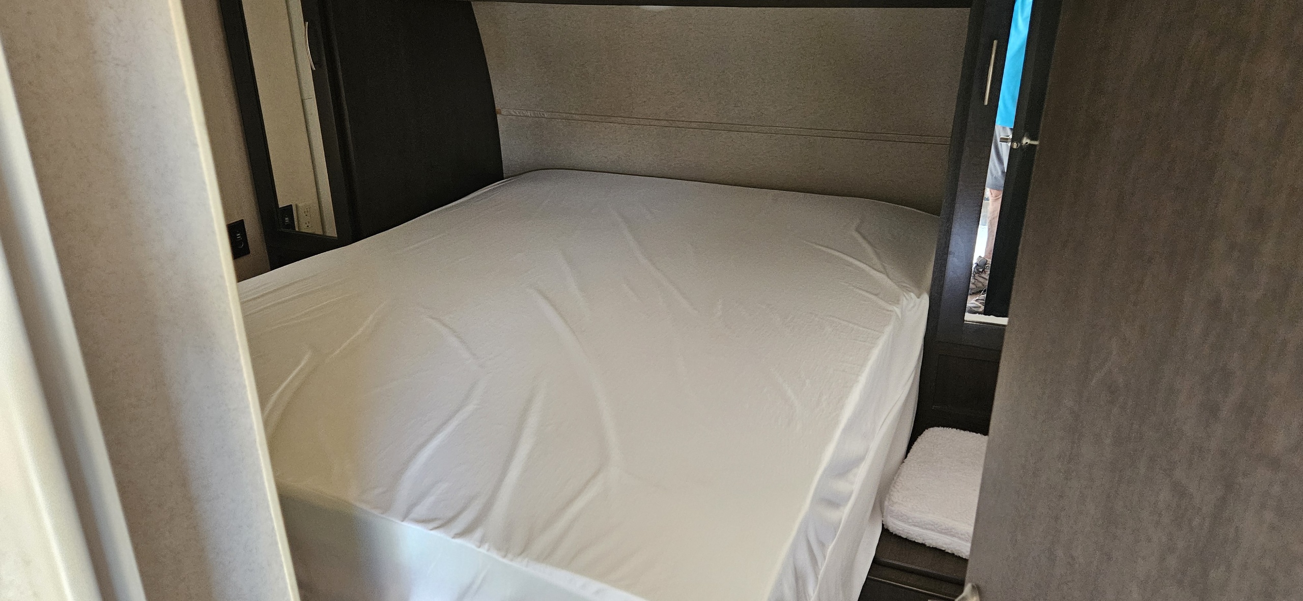 This very clean toy hauler tows great. Tires less than a year old. They are F-rated steel case tires. Queen walk-around bed with extra-thick foam topper that is very comfortable. Good depth closets on both sides. The living area comes with 2 swivel rockers and a fold-down sofa with tables. 2 TVs, one in the bedroom and one in the living area. Also has a drop-down queen bed.