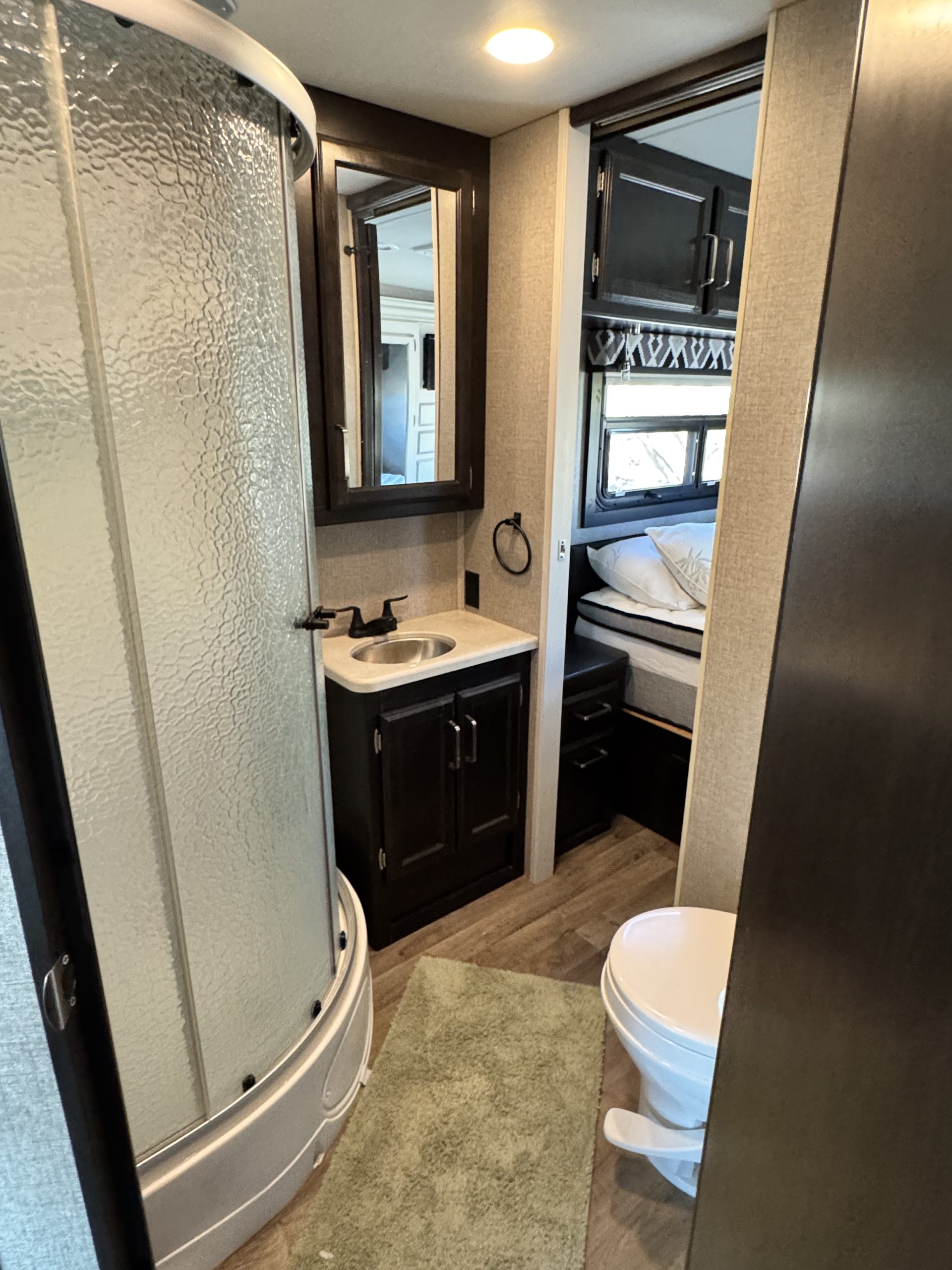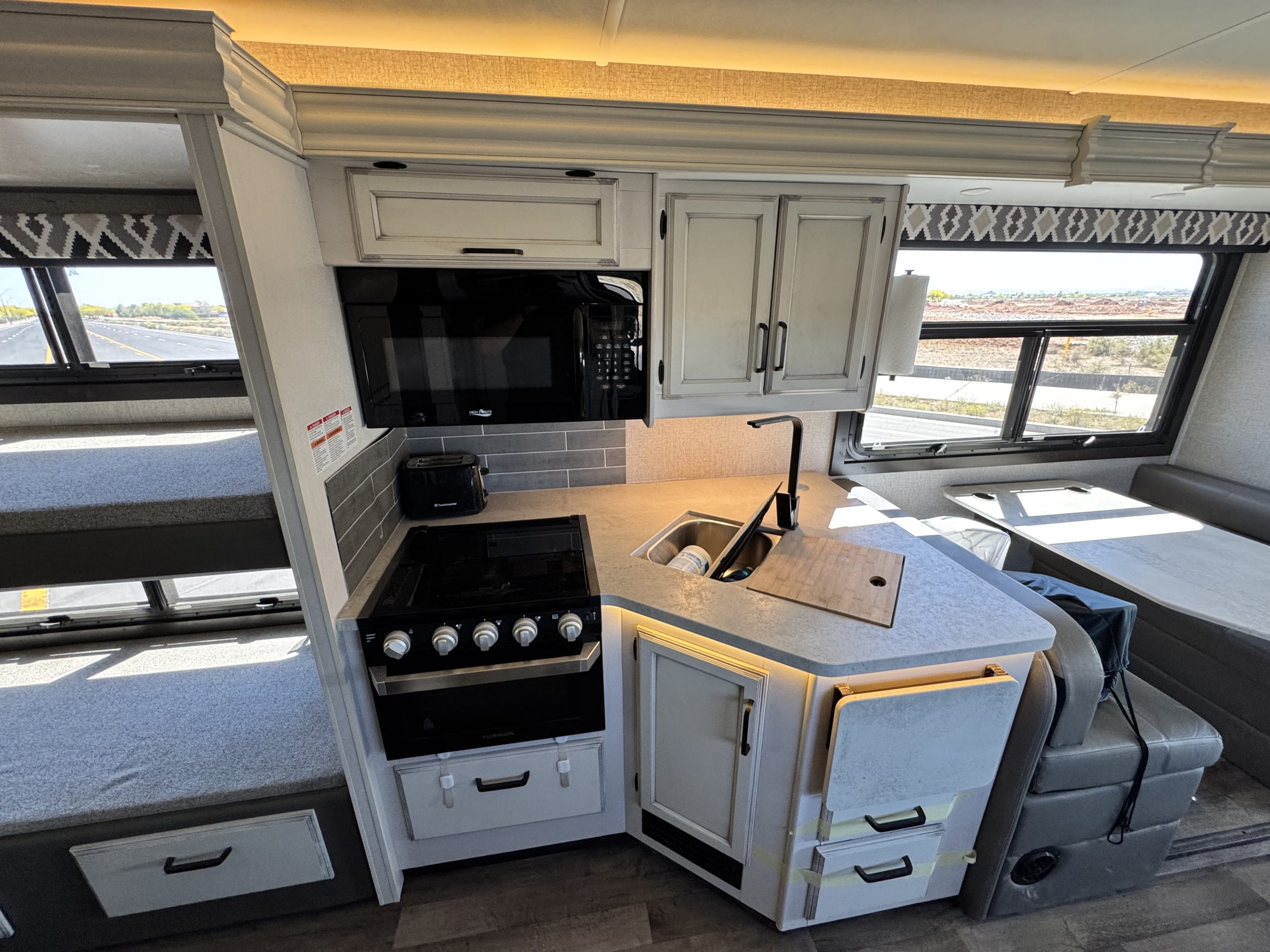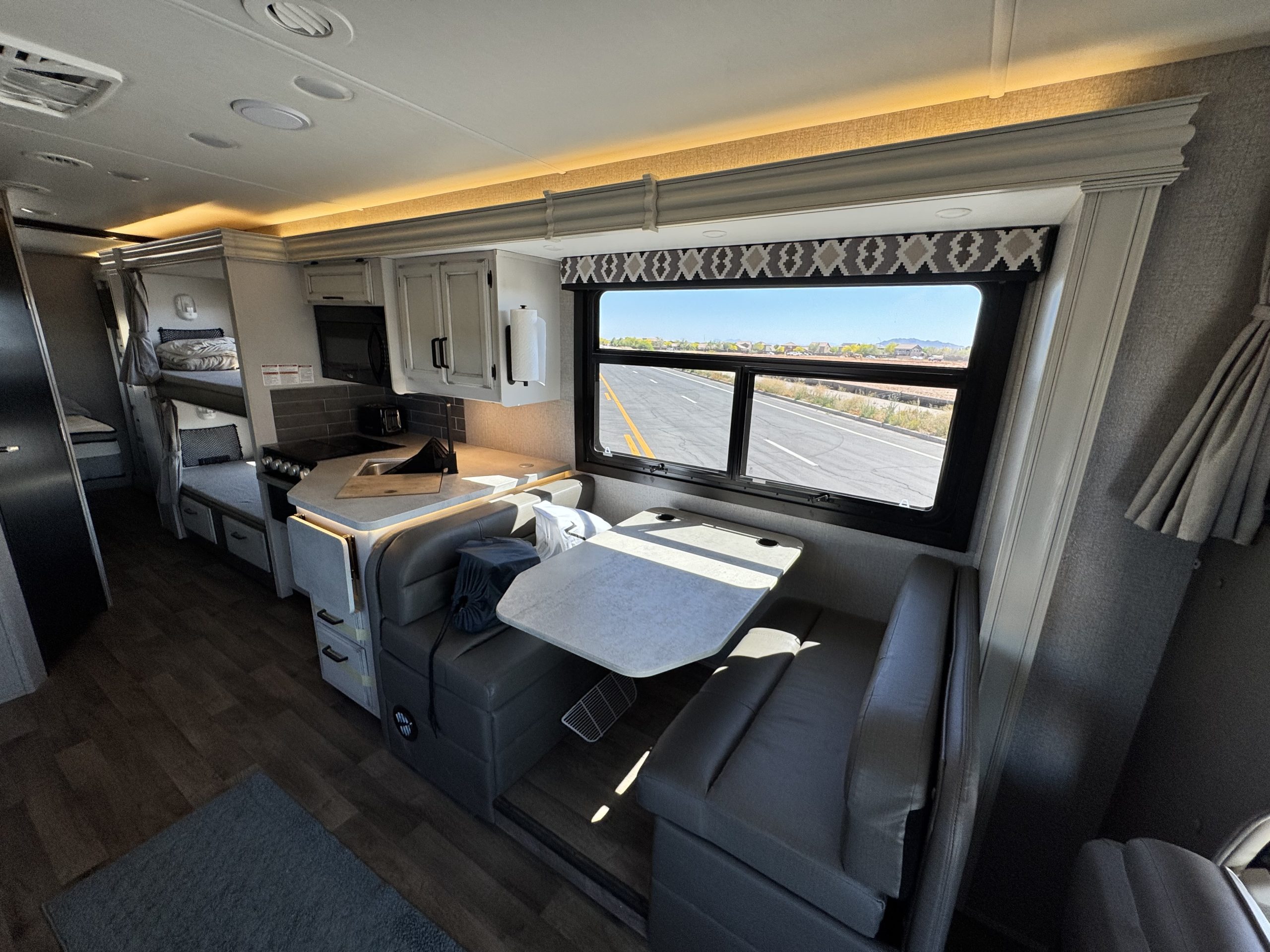 Jackknife sofa, dinette sleeper, and large over-cab bunk Full kitchen: 3-burner stove, oven, microwave, 4k onboard generator.