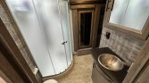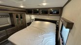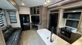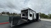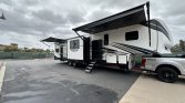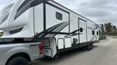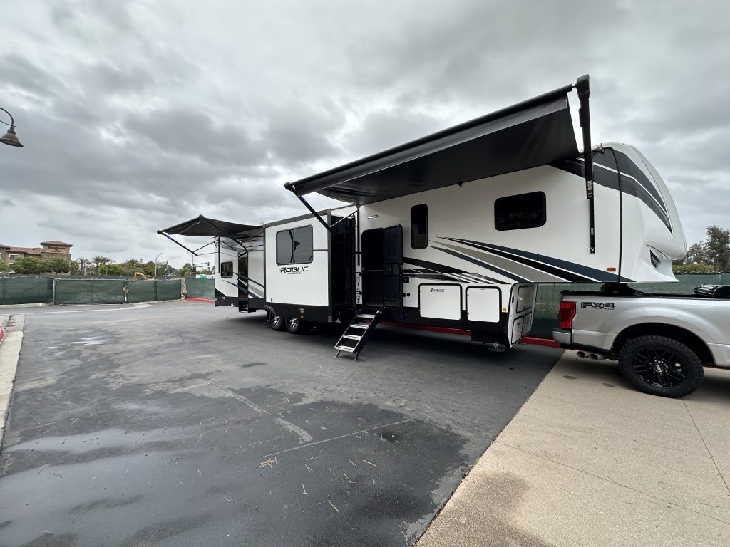 The 2022 Forest River Vengeance Rogue Armored 383G2 is a 45’1″ luxury fifth-wheel toy hauler featuring a 15’6″ garage, 3 slides, and sleeping for up to 8. Key specs include a ~13,500 lb dry weight, ~17,000 lb GVWR, 160 gal fresh water, and a 5,500-watt generator. It includes a half-bath in the garage, a 30-gallon fuel station, and a ramp patio system. Key Specifications (Approximate): Exterior Length: 45′ 1″ Exterior Height: 13′ 4″ UVW (Dry Weight): ~13,409 – 13,564 lbs GVWR: 17,025 – 17,300 lbs Hitch Weight: ~3,100 Garage Length: 15’6″ Fresh Water Capacity: 160 gallons Gray Water Capacity: 80 gallons Black Water Capacity: 100 gallons Key Features: Solar Panels with Juice Pack 300 Watts Garage: 5,000 lb capacity tie-downs, rear ramp door patio system with railing. Living Area: Solid surface countertops, three-burner cooktop, 12-volt refrigerator. Power/Leveling: 6-point Electric auto-leveling system, 50 AMP service, two A/Cs. Structure: 102″ wide body, aluminum frame, enclosed heated holding tanks.
