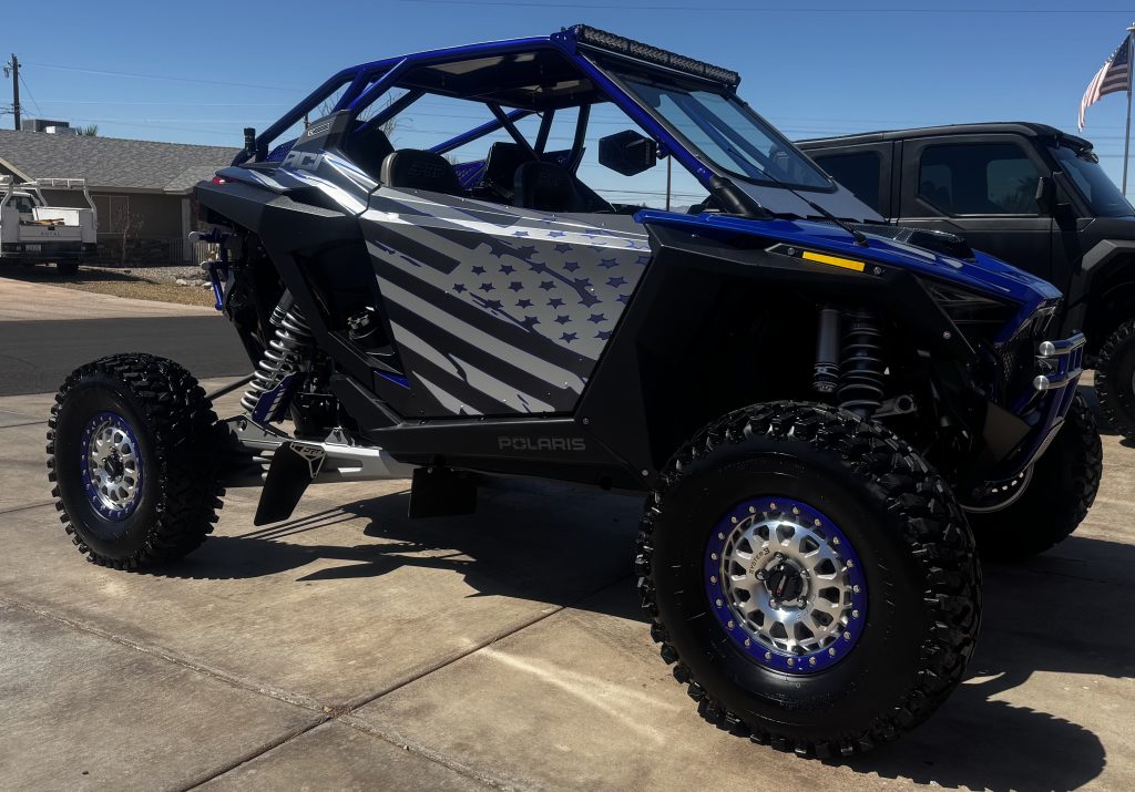 120 hrs. 300 dirt hrs. custom cage bumper system custom windshield PRP seats rock belts Baja Designs lite bar back lite bar System 3 bead lock wheels EVO exhaust header w/muffler with blue chrome tips 6 speaker stereo carbon fiber hood scoop and exhaust cover DRT parts throughout comes with paddles on stock rims and spare tire rock lights custom MAC Designs rear box floor mats powder coated thru out..Clean Title..Show Room Condition! Glamis ready! 12ft trailer available also…only serious!