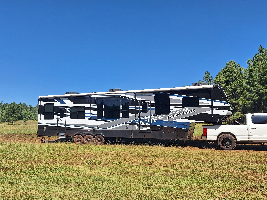 2022 Keystone Raptor 415 painted, 3 ACs, 15ft garage, garage patio, slide outs, powered awnings, hydraulic leveling system, on board generator, fire place, solar, FULL SIZE FRIDGE! Awesome trailer….pulls great……come take a look!