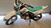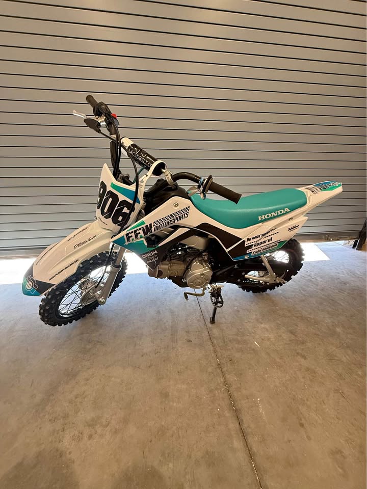 2023 Honda CRF 110 white and teal color with lots of goodies. It has coopinsting built black wheels with black spokes and teal nipples it’s got a set of nice odi tall bars with full size lock on throttle conversion also has a heavy duty rear shock and some nice aftermarket pegs selling because I don’t ride it anymore.