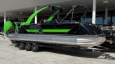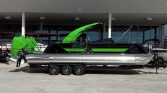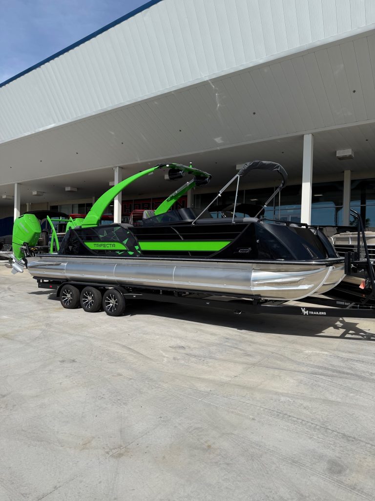 2026 Trifecta 29’ Sport RF9DC. Twin 400 v10’s with 6” jack plates. Painted green motors to match. Cool touch Uphlostrey. Front and rear Bimini. Wet sound stereo system w/sub and added tower speakers. Electric driver and passenger seats. Big simrad touchscreen screen. Electric power steering. Custom Tripple axle V/M trailer.