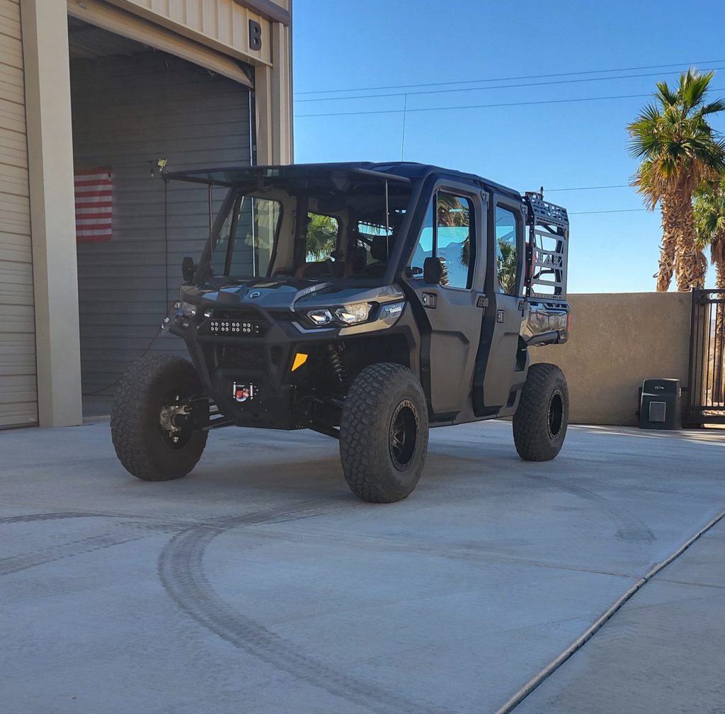 2022 Canam Defender. Pci radio, thumper fab cage with spare tire holder, 33″ BFG tires with weld wheels, HCR upper and lower A arms both front and back with Keller ball joints, Z Bros pin top schocks front and rear, vision X light bar with two amber and two white. Two Rear red color whips, has A/C and heat. 995 miles. Original owner kept in lake havasu AZ.