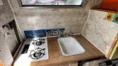 🔹 A fully equipped kitchen with a two-burner stove, toaster oven, and fridge
