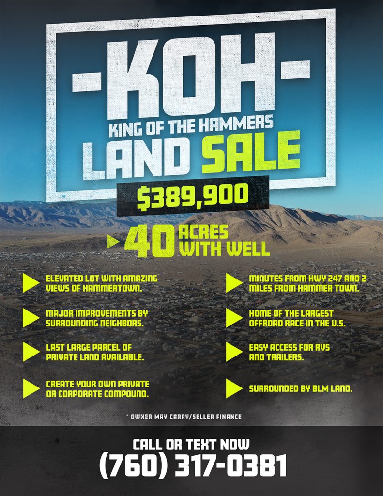 “40 Acres with a well in the heart of the King of the Hammers. This is the last available large private land that has not sold near Lasertown, Brenthel Trophy Truck School, and The Forty. Don’t miss out, this will go quick.