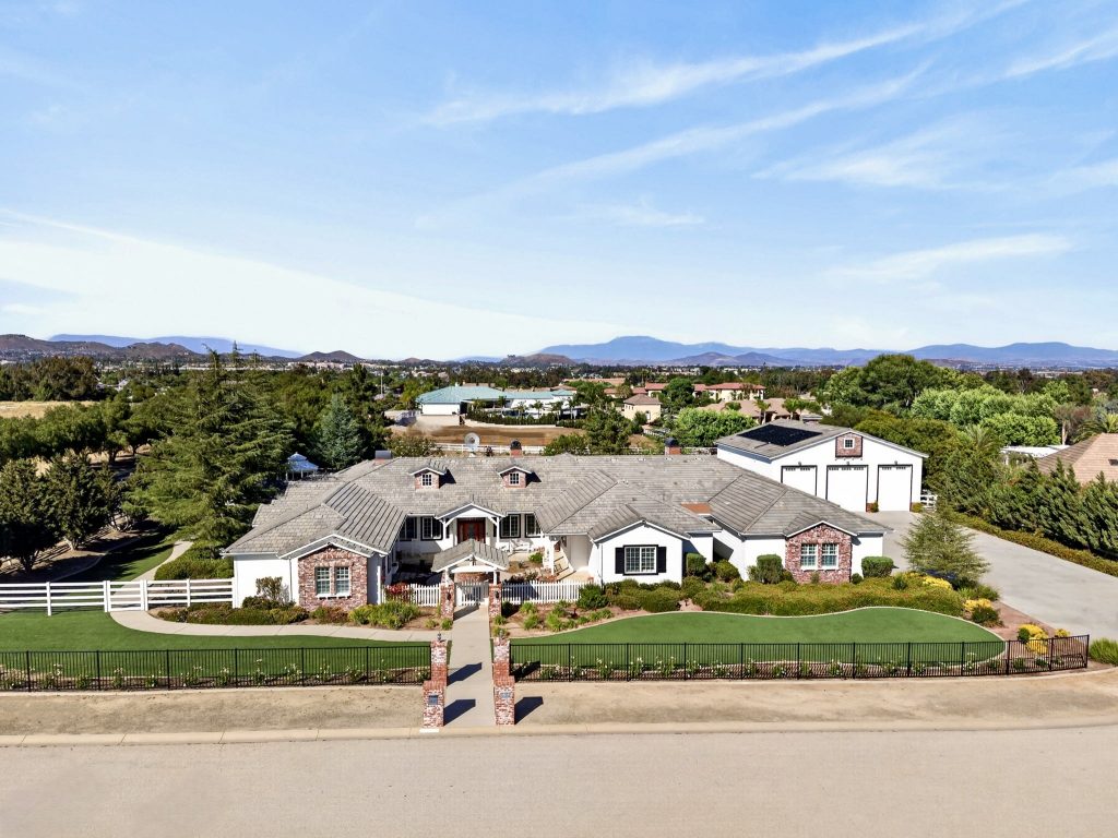 Iconic West Murrieta Single Story Ranch home on over 2 acres is now being offered to the market for sale for the first time in nearly 20 years. This incredible estate offers 5,736 sf of pristine finished living space with an additional 2,000 sf of covered and heated patio, 1,843 sf of attached fully finished garage space AND 2,600 sf of additional detached fully finished shop/garage space. The unique and immaculate ranch home has 5 large bedrooms with ensuites, 7 bathrooms, with an addition full bath in the detached garage for a total of 8. The layout is grand and traditional, including an oversized family living room, formal dining, large custom kitchen with additional eating area, immense 12 place projection-theater, large laundry room with dual washer/dryer and dryer closet, and grand mud room off the attached garage, complete with a large catch-all island, cabinetry and powder room. All areas are finished with sensible detail and accents in brick, custom paneling and trimwork throughout. The kitchen and eating area transition seamlessly to the exterior patio kitchen, with additional oven, sink, large grill, fireplace, and enough space for very large private entertainment gatherings or ceremonious occasions. The pool and large spa are conveniently located immediately adjacent to the wrap around rear patio area making for a unique and comfortable family setting. The detached garage offers dramatic 16+ foot ceilings with ventilation fans, additional kitchenette, an abundance of storage cabinets, large bar/workbench, full bathroom, and a large mezzanine perfect for a man-cave, office or potential ADU/guest living space. The rear roll up door allows for large pull-throughs into the fully gated rear yard of almost an acre. This property is zoned for horses/animals and offers ample space for MANY stalls, shelters, & arena.