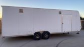 27-Foot Universal Box Trailer with 25-gallon fuel station, folding work bench, lights, front cabinet and wench.